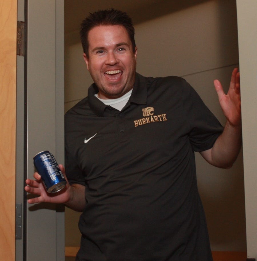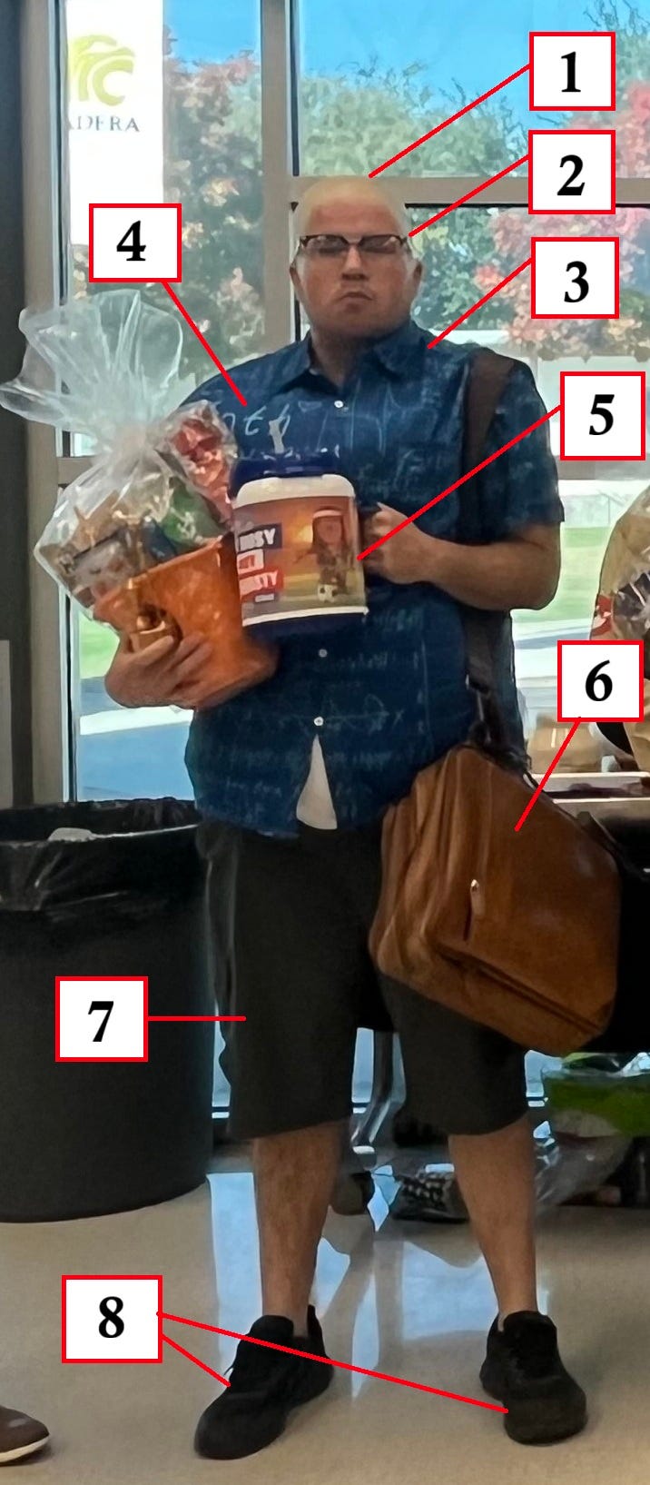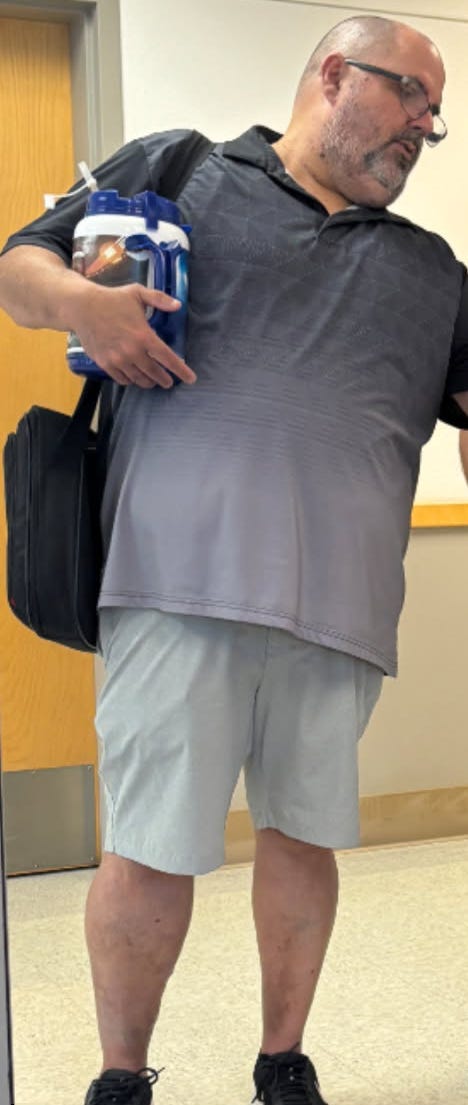 On Friday, October 31, 2025, Mr. Burkarth arrived on the MCC’s campus dressed as usual, without a costume. The photo below, taken either before noon or after 1 p.m. that day (October 31), shows his attire. [image below]