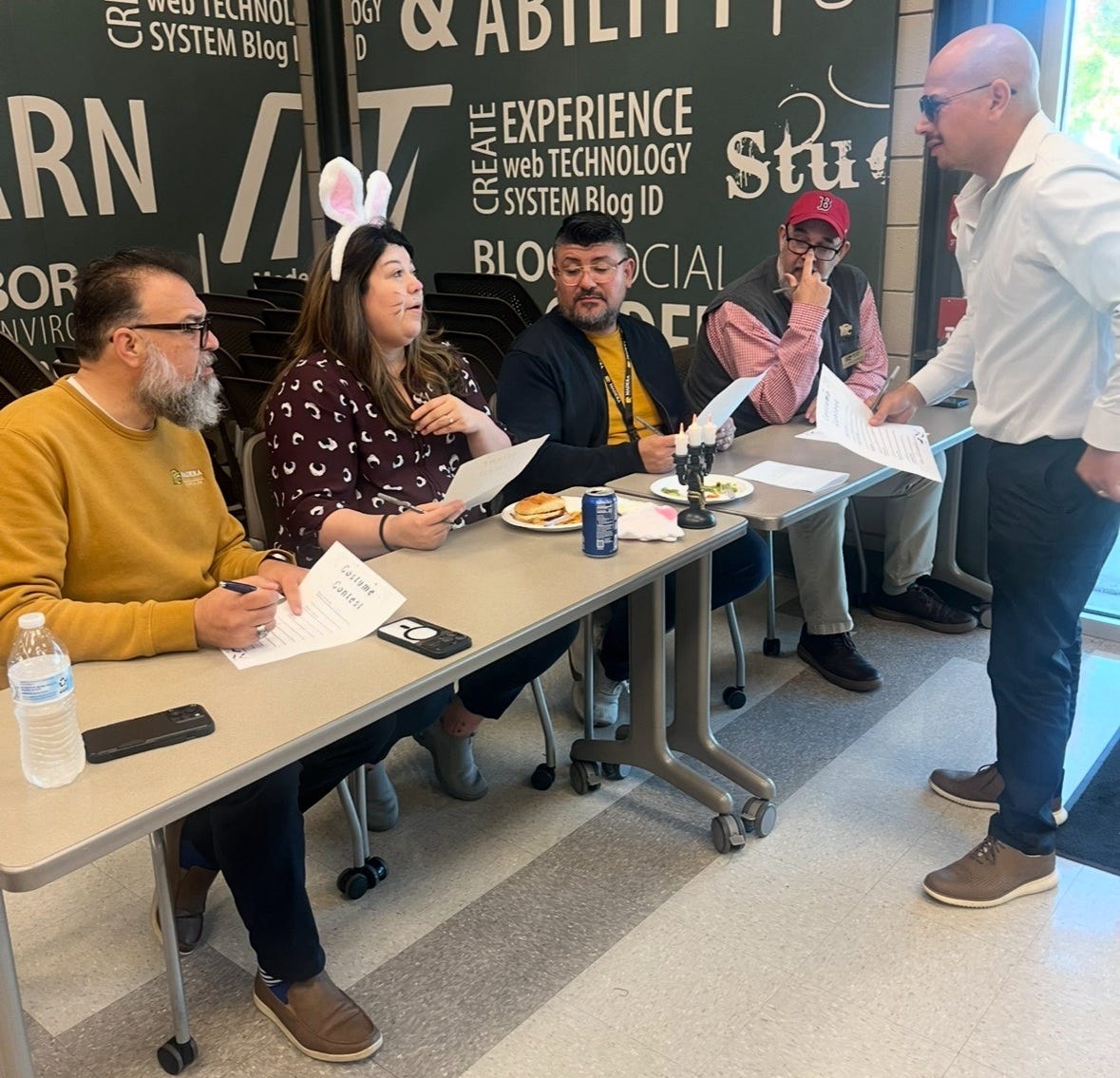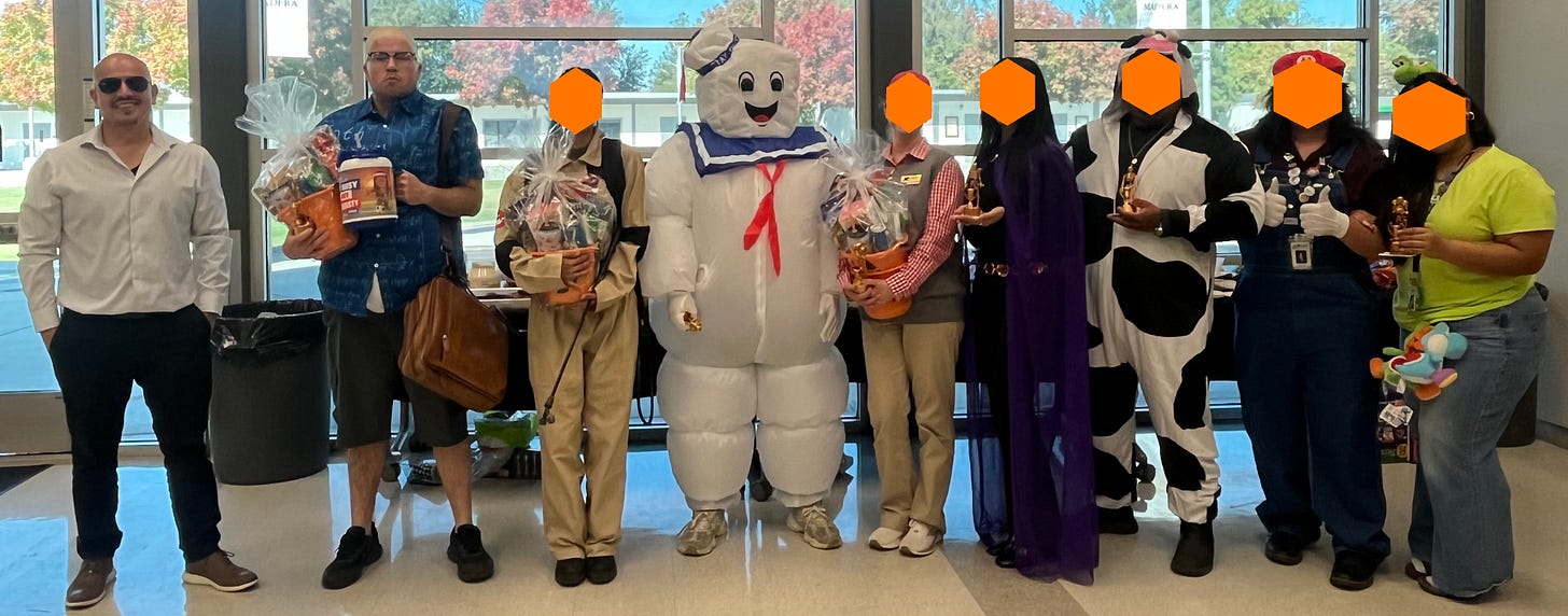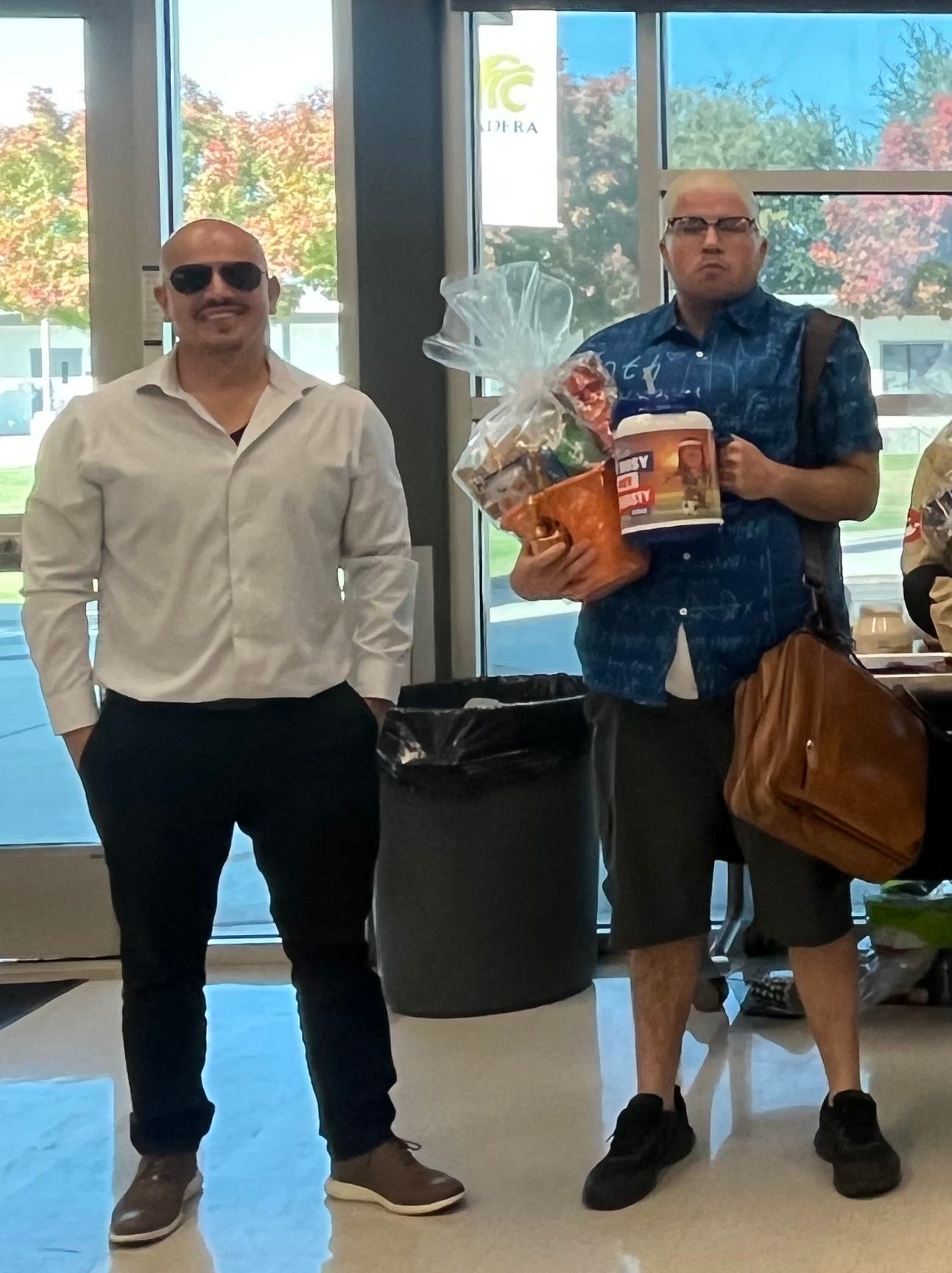 However, further evidence reveals a far more troubling reality. The prize Burkarth holds in the photo, a gift basket, was awarded to him for winning the costume contest at the potluck. Our investigation uncovered that five MCC administrators served as judges: President Ángel Reyna, Vice President of Administrative Services Matthew Richmond, Interim Dean of Students Nickolas Valencia-Lucio, Director of Institutional Research, Assessment & Planning Elizabeth Villalobos, and Director of Financial Aid Gary Nicholes. [images below]