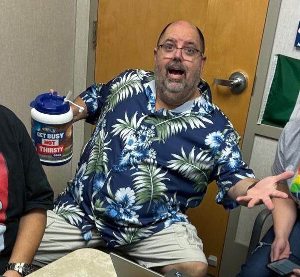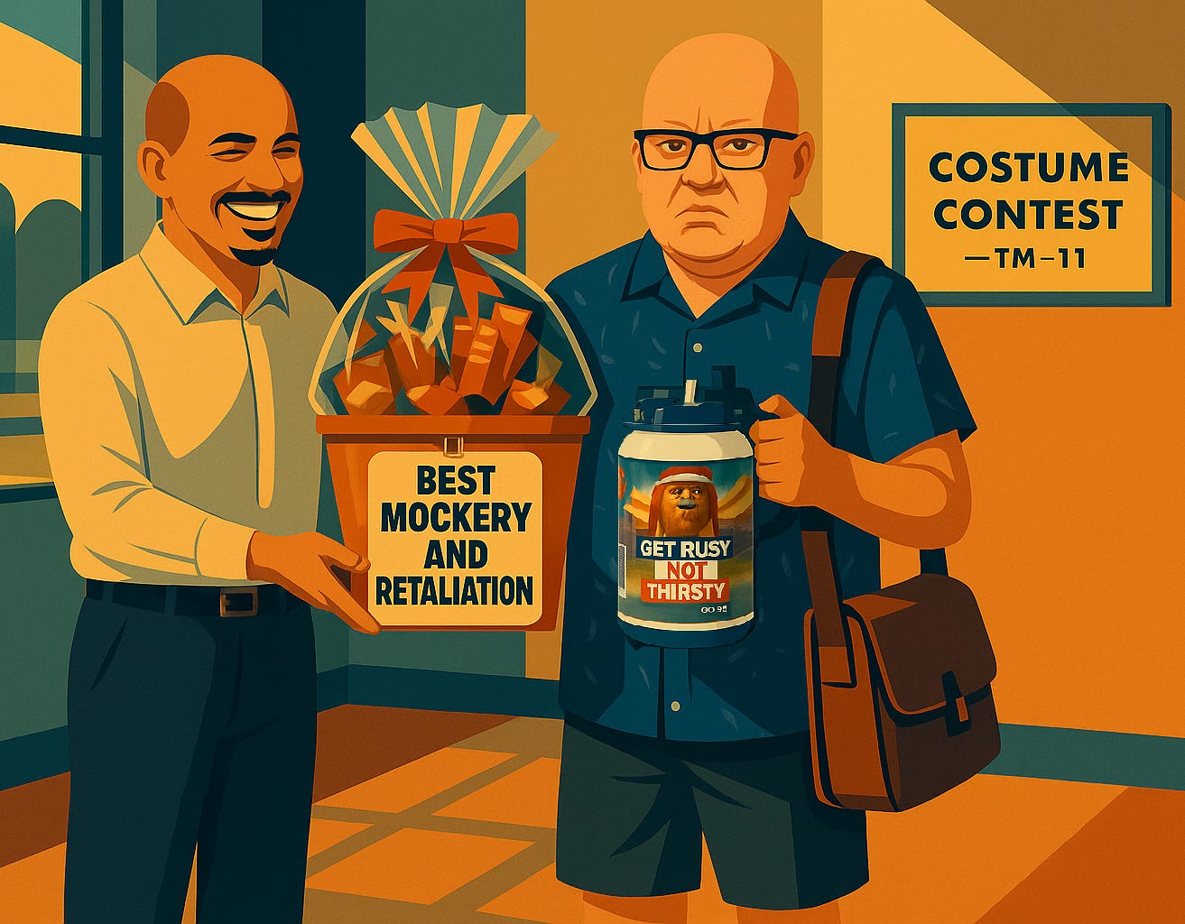 According to the evidence we have outlined, either Mr. Burkarth shamelessly, maliciously, and without consent mocked Mr. Kandarian, or there exists at MCC another “math guy” who is bald and heavyset, wears Hawaiian shirts and shorts, sports black sneakers without socks, dons black-framed glasses, carries a messenger bag, and uniquely owns an AM/PM TOOMGIS jug. Thanks to Burkarth’s painstaking attention to detail in replicating this distinctive look, we confidently assert that Kandarian is the only person in MCC’s history, or indeed in all of humanity, who fits this one-of-a-kind persona.