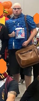 Burkarth changed into a costume for this event. In the following image, he is wearing a blue shirt and carrying a brown messenger bag [image below]